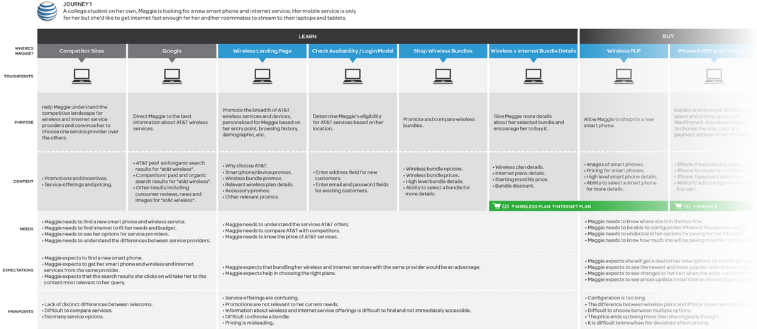Using the existing persona of “Maggie”, we created two distinct scenarios, user paths and customer journeys through the AT&T shopping experience. The first saw Maggie shopping for internet service and the second as an established AT&T customer. Through both of the journeys we looked for opportunities to use data intelligently to personalize the experience for Maggie.