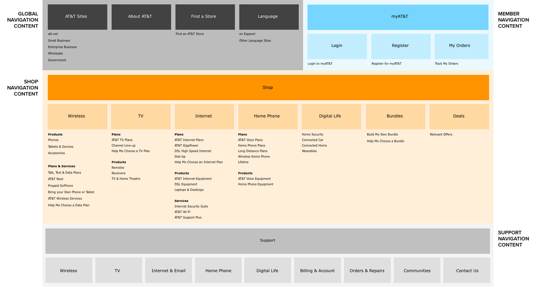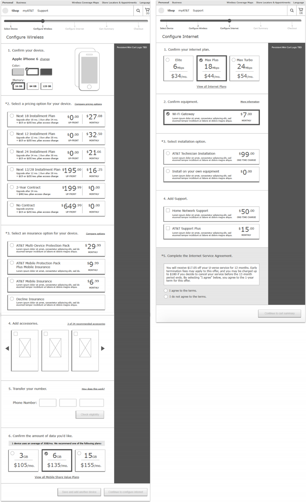 Additionally, as the vision came together, I audited the existing ATT.com navigation structure and content to provide a refined navigation recommendation. I also worked out what an optimized configurator and checkout flow could look like and wire framed key screens for the process.