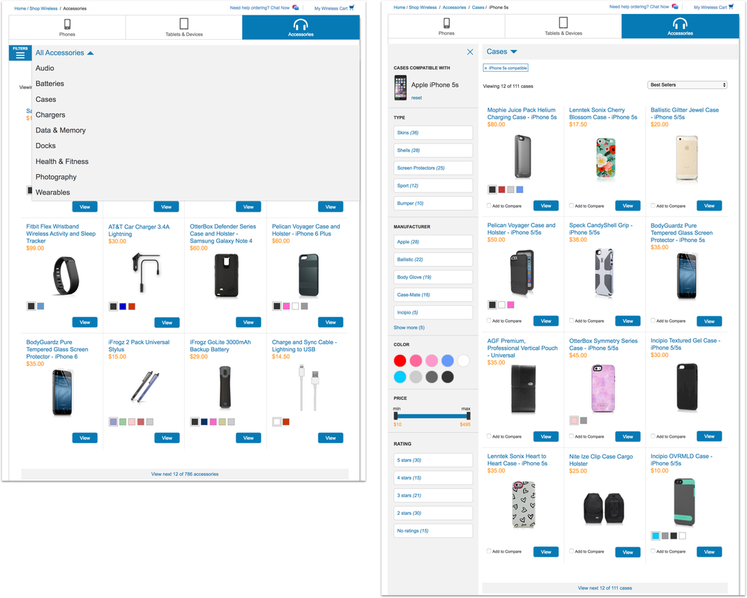 To further improve the AT&T e-commerce experience, I worked to optimize the product listing page by suggesting a solution that would integrate all physical products into one cohesive shop experience. I explored many different options and designed, prototyped and tested three variations of the listing page and filtering system. User testing dictated that the more traditional approach was the clear winner in browsing and finding a particular product (option 1, below).