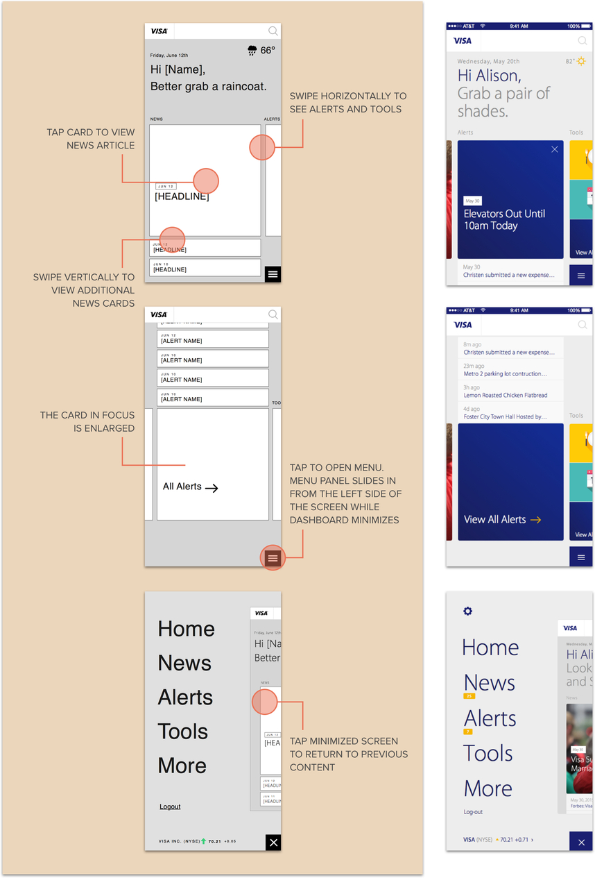 Our initial ask centered around a mobile iOS app dreamed up by one of Visa's tech leads to supplement the existing intranet experience. As such, this mobile first approach allowed us to solution for small screens, creating a hyper-contextual, personalized experience and culling much of the existing content to focus on what matters most to employees.